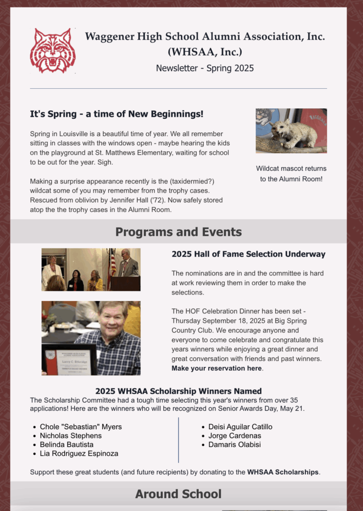We publish a quarterly newsletter with Association highlights, links to resources, some school news, and upcoming events.