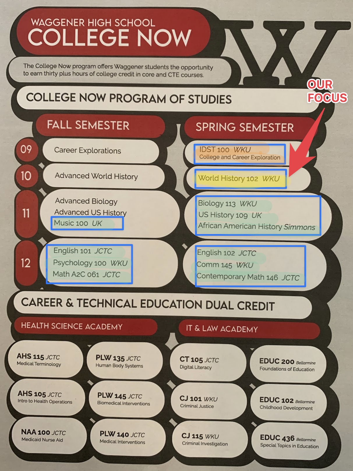 It offers WHS students the opportunity to earn more than 30 college credit hours through managed partnerships with Kentucky colleges and universities including UofL, UofK, WKU, Campbellsville University and JCTC.